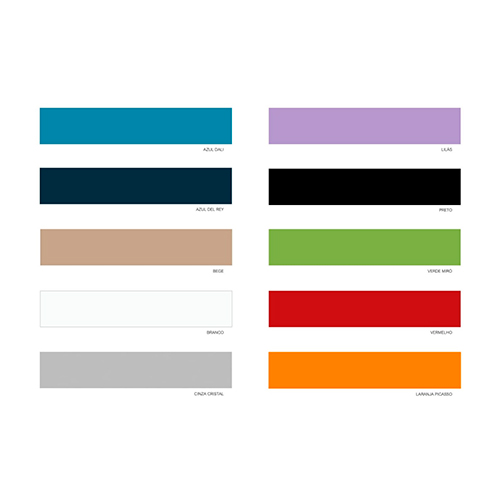 Cinza Cristal, Azul Dali, Azul Del Rey, Bege Areia, Branco, Lilás, Preto, Verde Miró, Laranja Picasso, Vermelho.